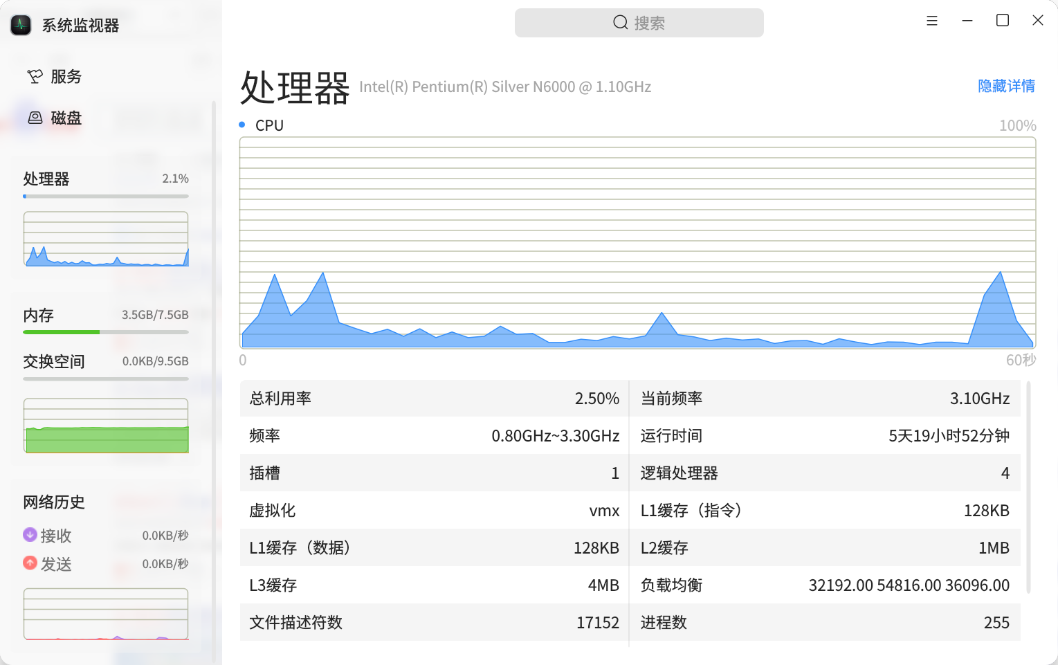 新增处理器详情页展示处理器总利用率、当前频率、频率、插槽、逻辑处理器、虚拟化、L1缓存(指令)、L1缓存(数据)、L2缓存、L3缓存、负载均衡、文件描述符数、进程数、线程数、计算机名等信息。