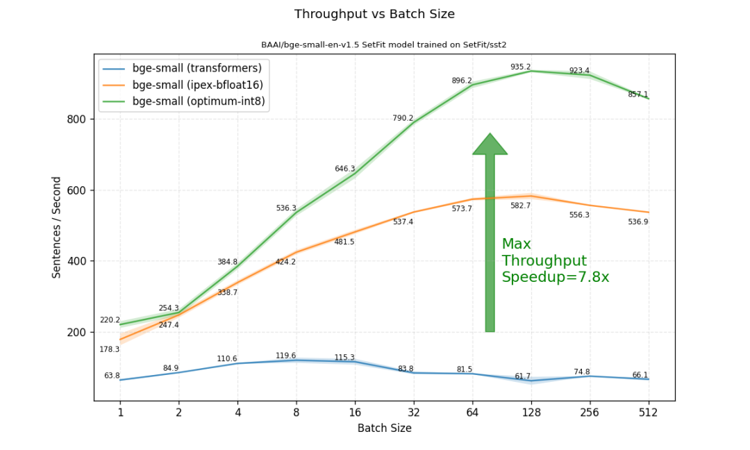 我们将焦点转向不同 batch size 下的吞吐量。这里,我们获得了更大的加速。如果比较最高吞吐量 (不限 batch size) ,优化后的模型比原始 transformers fp32 模型高 7.8 倍!
