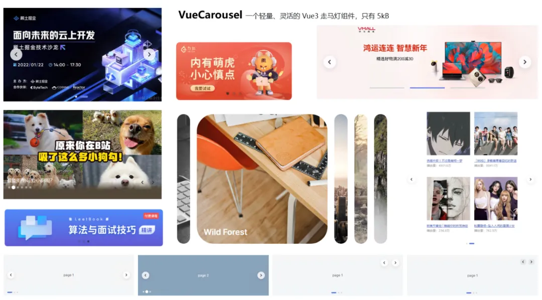 可以看到它的功能是很强大的,可以应用于丰富的业务场景,接下来就带大家一起来设计和实现 VueCarousel。