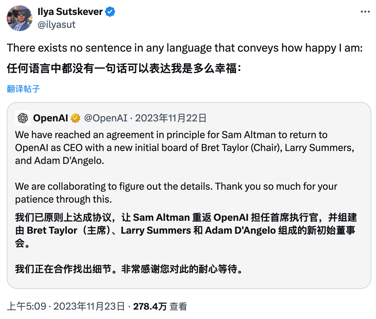 去年 11 月 OpenAI 董事会发生大动荡后,许多员工纷纷在社交媒体表达了自己的态度,但 Ilya Sutskever 一直保持沉默——直到动荡真正平息后才更新了一条动态: