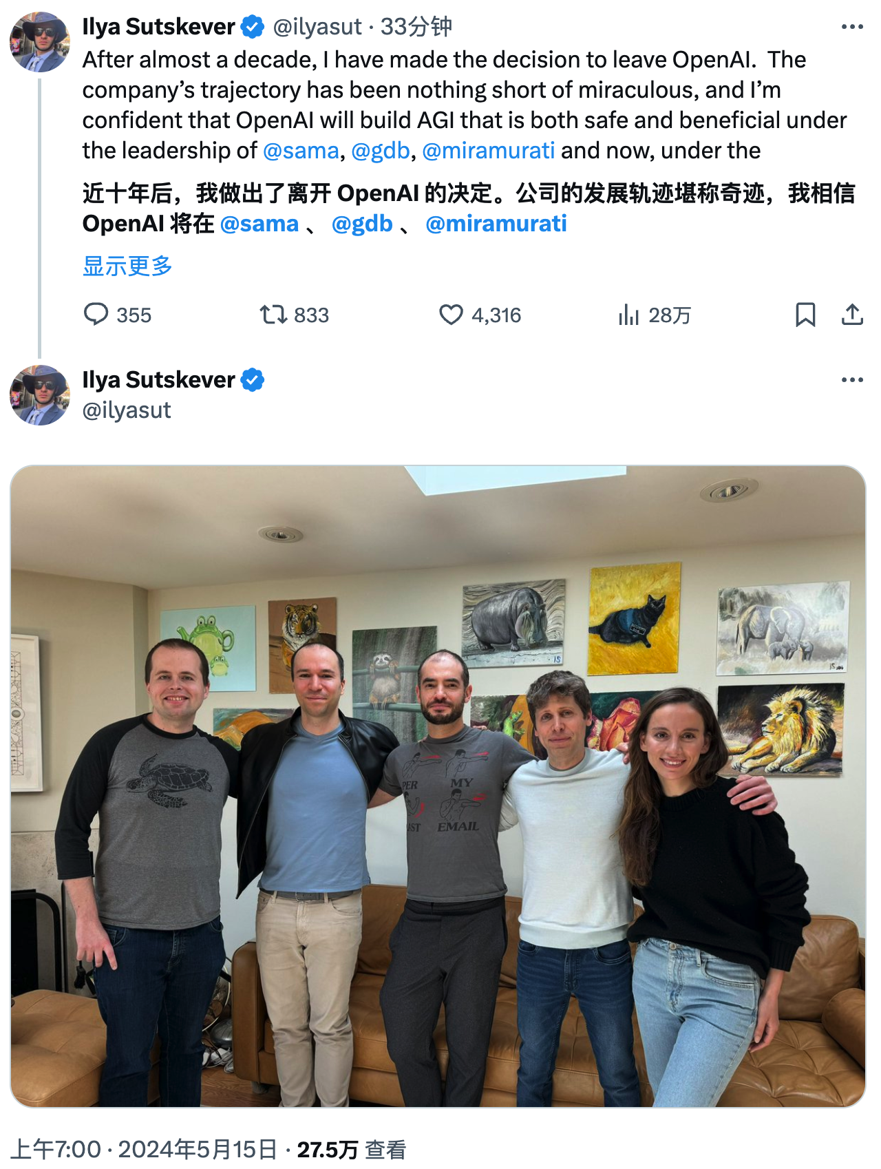 近十年后,我做出了离开 OpenAI 的决定。公司的发展轨迹堪称奇迹,我相信 OpenAI 将在 @sama、@gdb、@miramurati 以及现在的 @merettm 的研究团队领导下,打造出既安全又有益的 AGI。 能与大家共事是我的荣幸,我会非常想念大家的。
