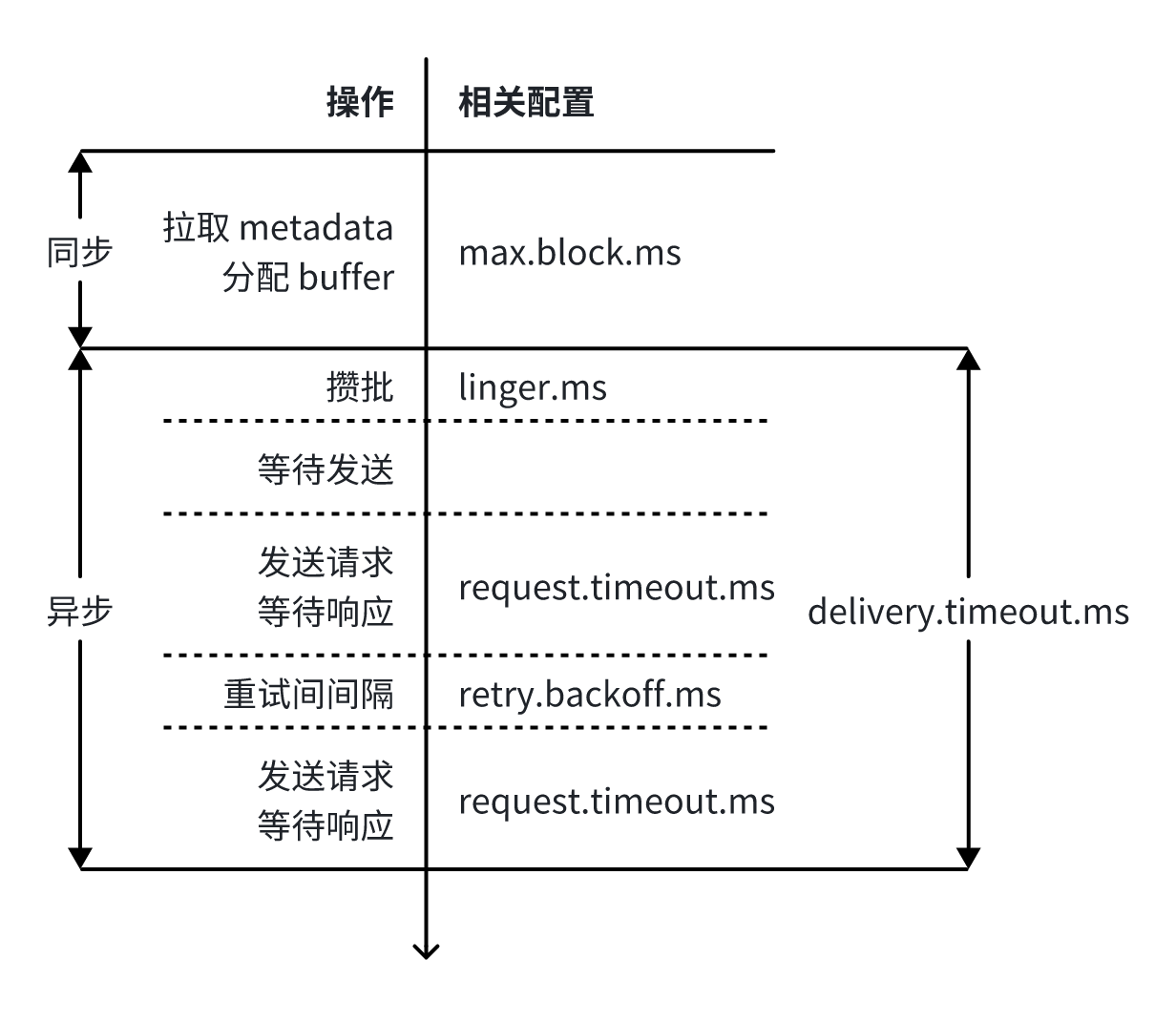 Kafka Producer 定义了一系列超时相关的配置,用于控制发送消息的各个阶段允许耗时的最大值。梳理如下图: