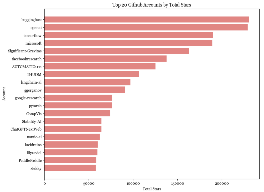 在排名top 20的账户中,唯一的个人账户是lucidrains。在拥有最多star数的top 20账户中(仅计算通用人工智能代码库),只有4个是个人账户: