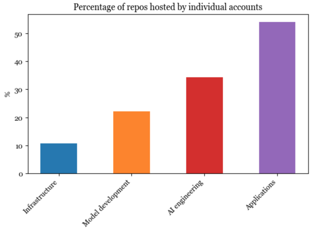 除这四层外,还有另一个类别,即模型存储库(Model Repos)。这些存储库由公司和研究人员创建,用于分享与他们模型相关的代码。这一类别的存储库示例包括CompVis/stable-diffusion、openai/whisper和facebookresearch/llama。