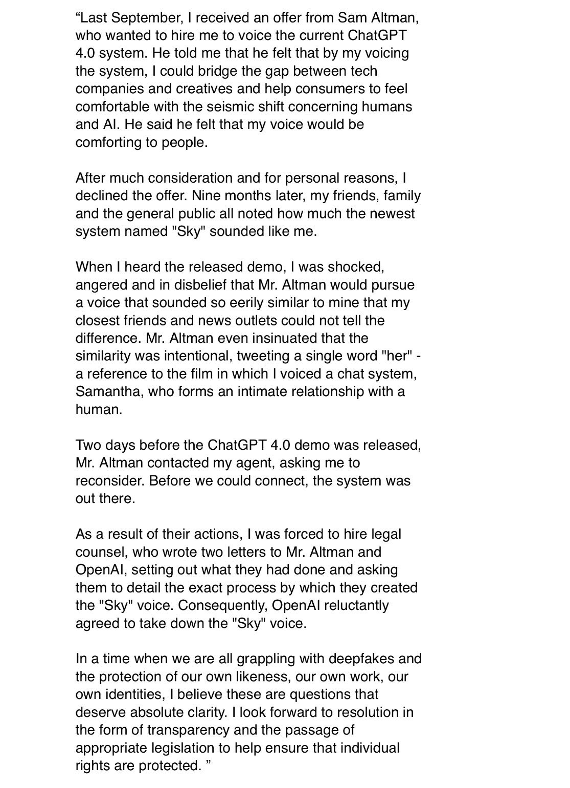 当我听到发布的演示时,我感到震惊、愤怒和难以置信,Altman 先生会追求一个听起来如此像我的声音,以至于我的亲密朋友和新闻媒体都无法分辨。Altman 先生甚至暗示这种相似性是故意的,他在推特上发了一句话‘her’—— 这是指我在电影《Her》中配音的聊天系统 Samantha,她与一个人类建立了亲密关系。