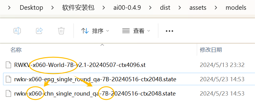 获得 .st 后缀的 RWKV 模型后,我们需要在 assets 文件夹中新建一个 models 文件夹,并将 RWKV 模型放在此文件夹中。
