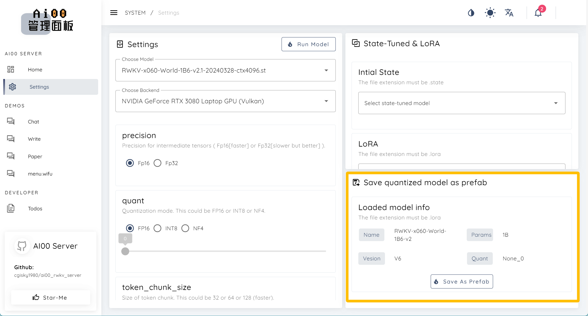 在 Ai00 的 WebUI - Setting 界面,可以以 prefab 格式导出量化后的 RWKV 模型。