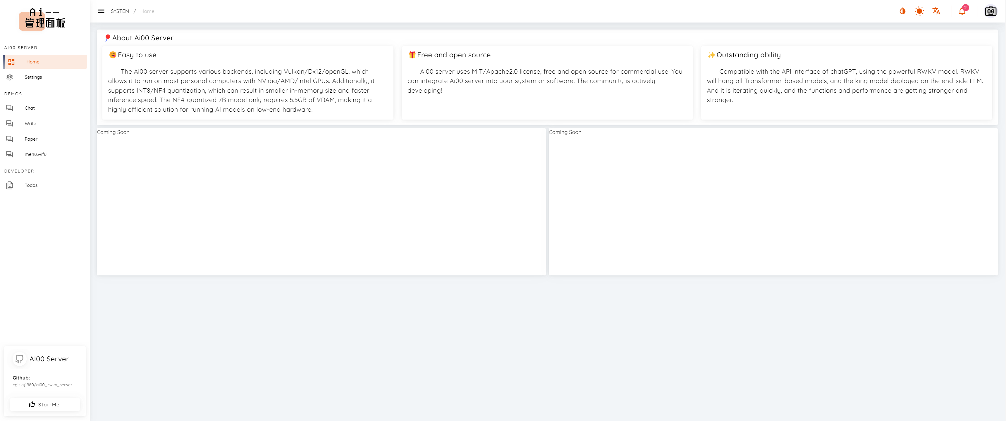 Ai00 Server 是基于 web-rwkv 推理引擎的 RWKV 语言模型推理 API 服务器。它本身也是一个基于 MIT 协议的开源软件,由 RWKV 开源社区成员 @cryscan 和@顾真牛牵头成立的 Ai00-x 开发组开发。