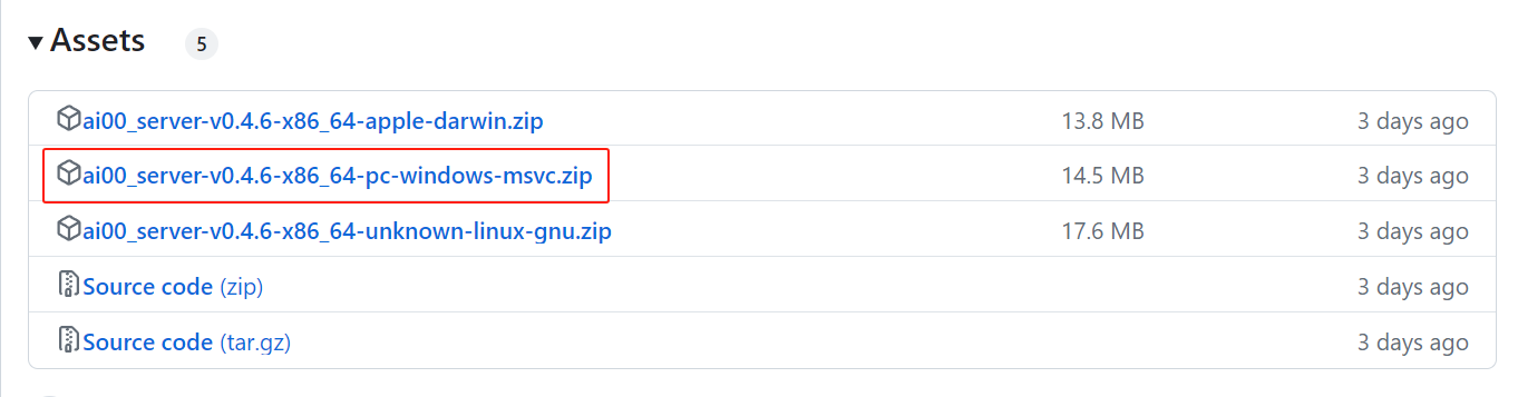 在每个版本发布的 Assets 版块可以找到已经打包好的 Ai00 Server 压缩包,下载并解压即可使用。