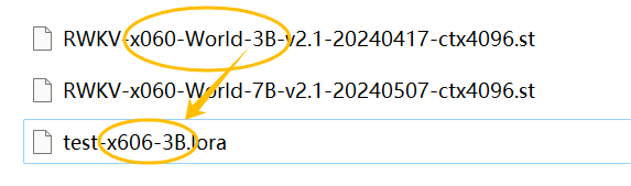 与挂载 state 相似,挂载 LoRA 文件时,必须使用与 LoRA 模型参数一致的基底 RWKV 模型。
