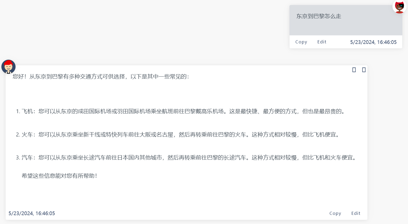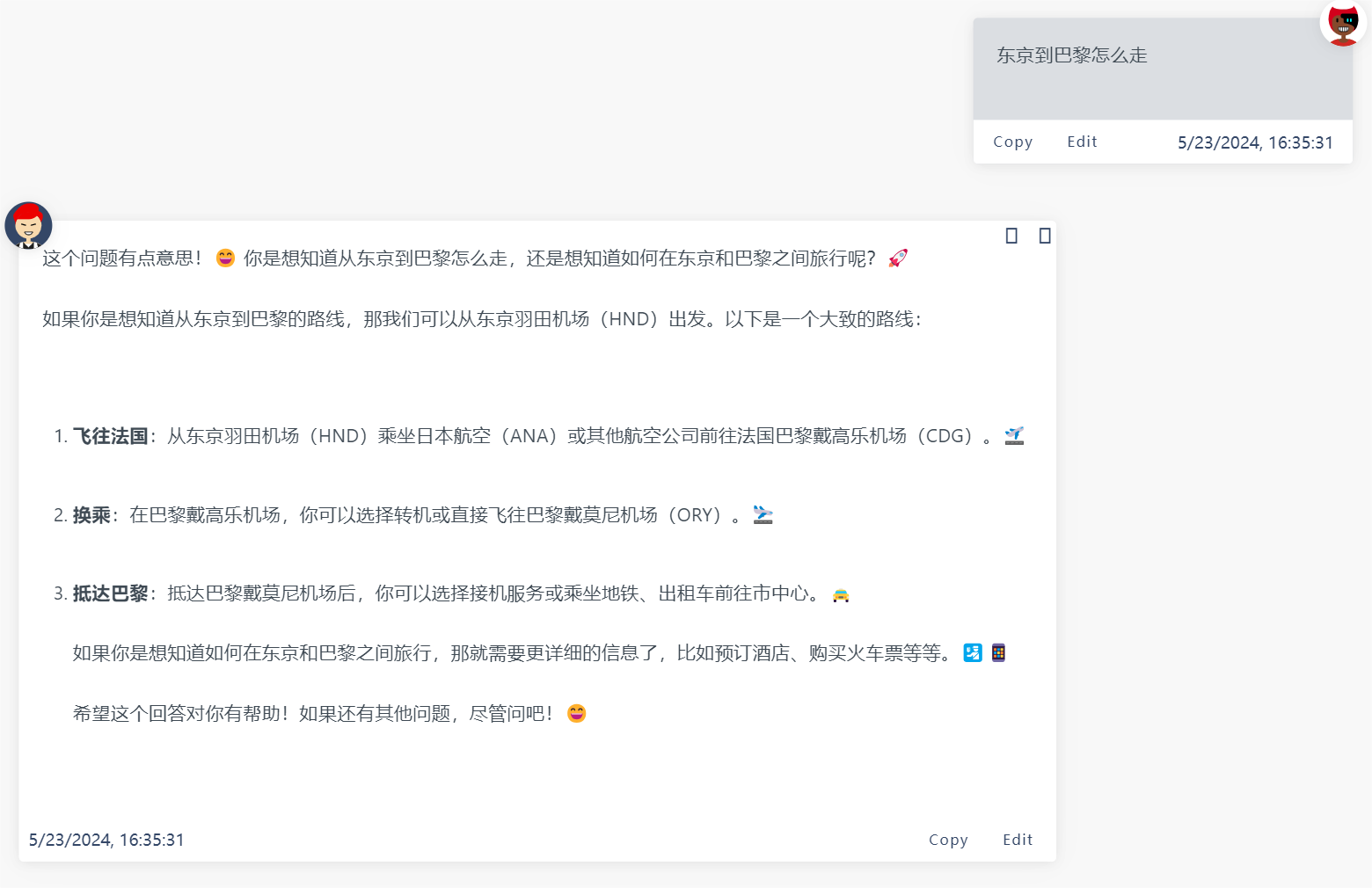 挂载 State 文件可以强化模型在某一类任务的表现。以一个强化单轮问答 + emoji 的 State 为例,同样都是“东京到巴黎怎么走”这个问题,模型在挂载该 State 前后的回答画风完全不同: