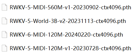 首先,可以从 RWKV 官方仓库中下载 .pth 后缀的 RWKV 模型,下载地址: