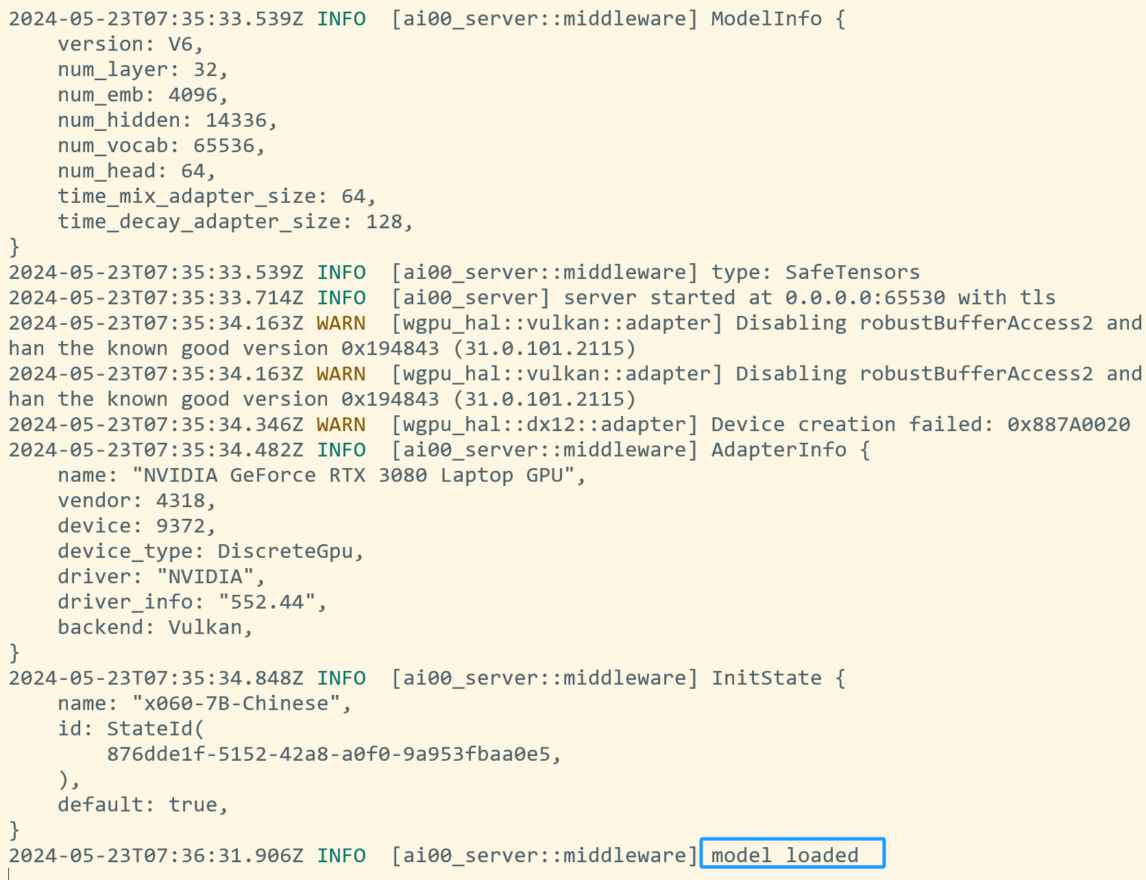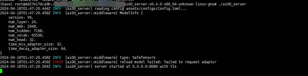 当命令行中出现 INFO [ai00_server::middleware] model reloaded 提示时,意味着模型已经加载完成: