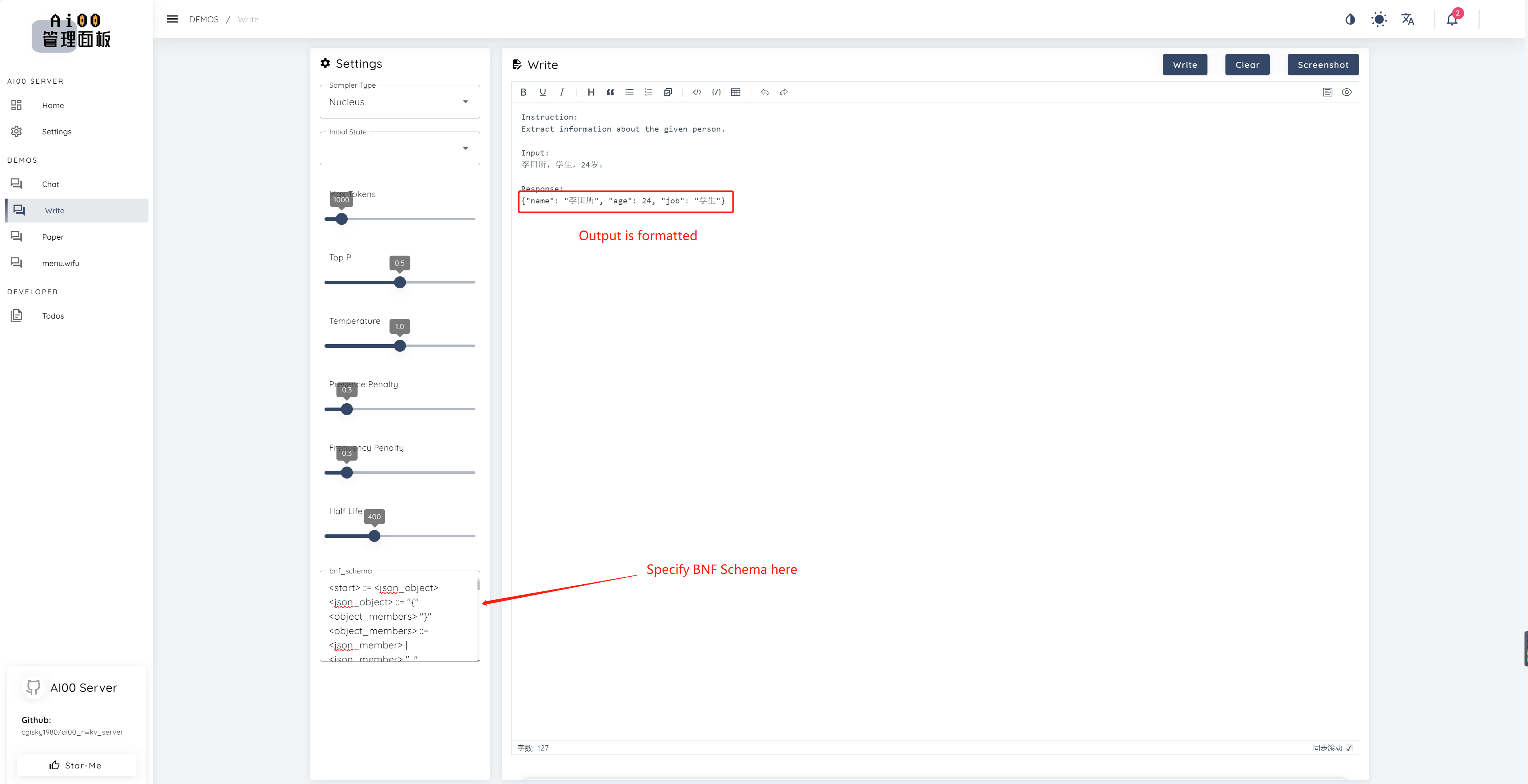 BNF 可以强制模型以您想要的格式输出(例如,JSON、带有指定字段的 markdown)。