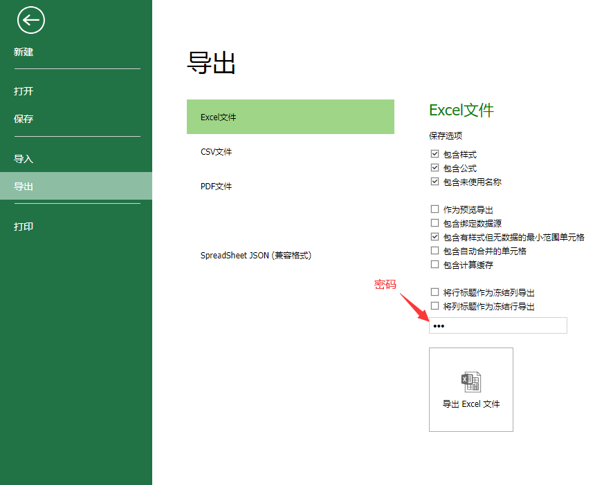 (4)选择 “Excel文件” 选项,在点击右侧的 “导出 Excel 文件” 按钮前,在上面的 “密码” 文本框中输入一个密码。