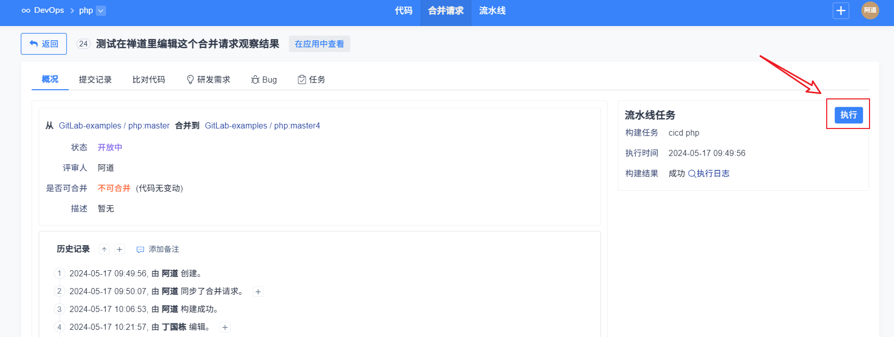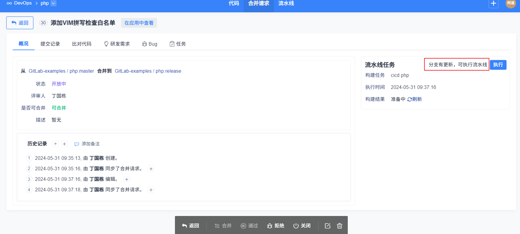 ▼合并请求中支持执行流水线,评审人员可以根据提交情况快速执行。