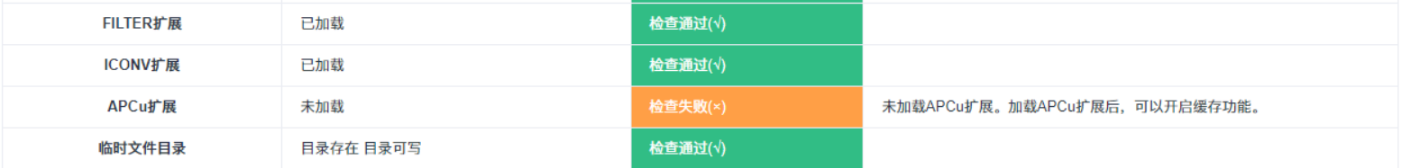 ▼安装过程中会检查是否开启了PHP-APCu扩展,如未加载会推荐安装。 如果加载了PHP-APCu扩展并且启用了apc.enabled选项,安装完成后会自动打开数据缓存功能。老用户升级过程会检查是否加载了PHP-APCu扩展并且启用了apc.enabled选项,如果检查通过会自动打开数据缓存功能。