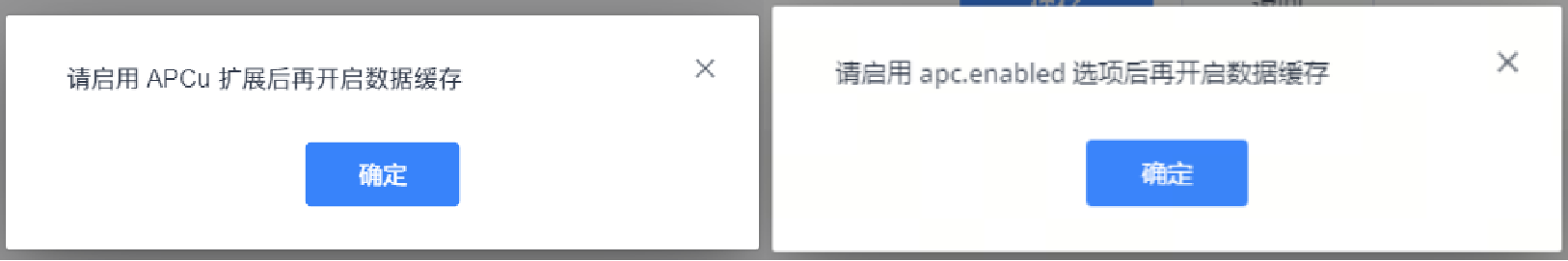 ▼有权限的用户可以在后台系统设置中开启或关闭缓存,也可以查看数据缓存功能的内存使用情况。开启数据缓存时会检查是否加载了PHP-APCu扩展并且启用了apc.enabled选项,如果检查未通过会弹出相关提示。