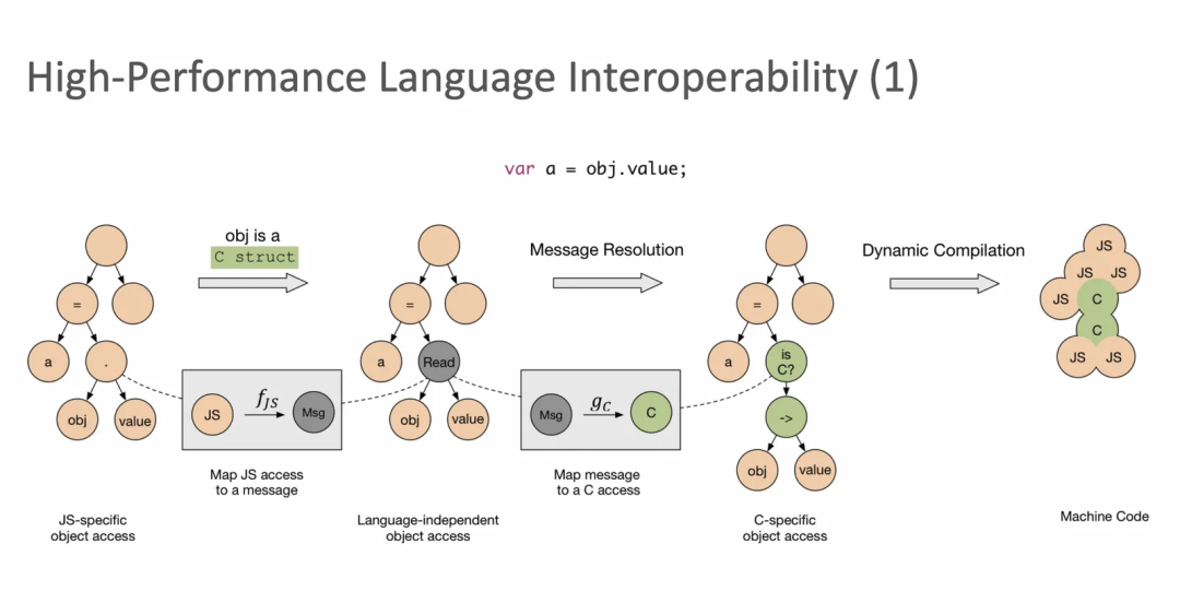 不熟悉GraalVM的同学可以看下这个介绍。这其实就是一个实验性的新的JVM,设计上具有更好的JIT能力来取代现有的JVM。但是GraalVM上有一个神奇的功能叫Truffle,他可以在JVM上实现各种动态语言比如Ruby,比如Python,比如JS。然后这些语言都可以JIT后以比肩V8这种原生引擎的效率来执行。同时又保持了和Java良好的可互操作性(毕竟运行在Java的VM上)。