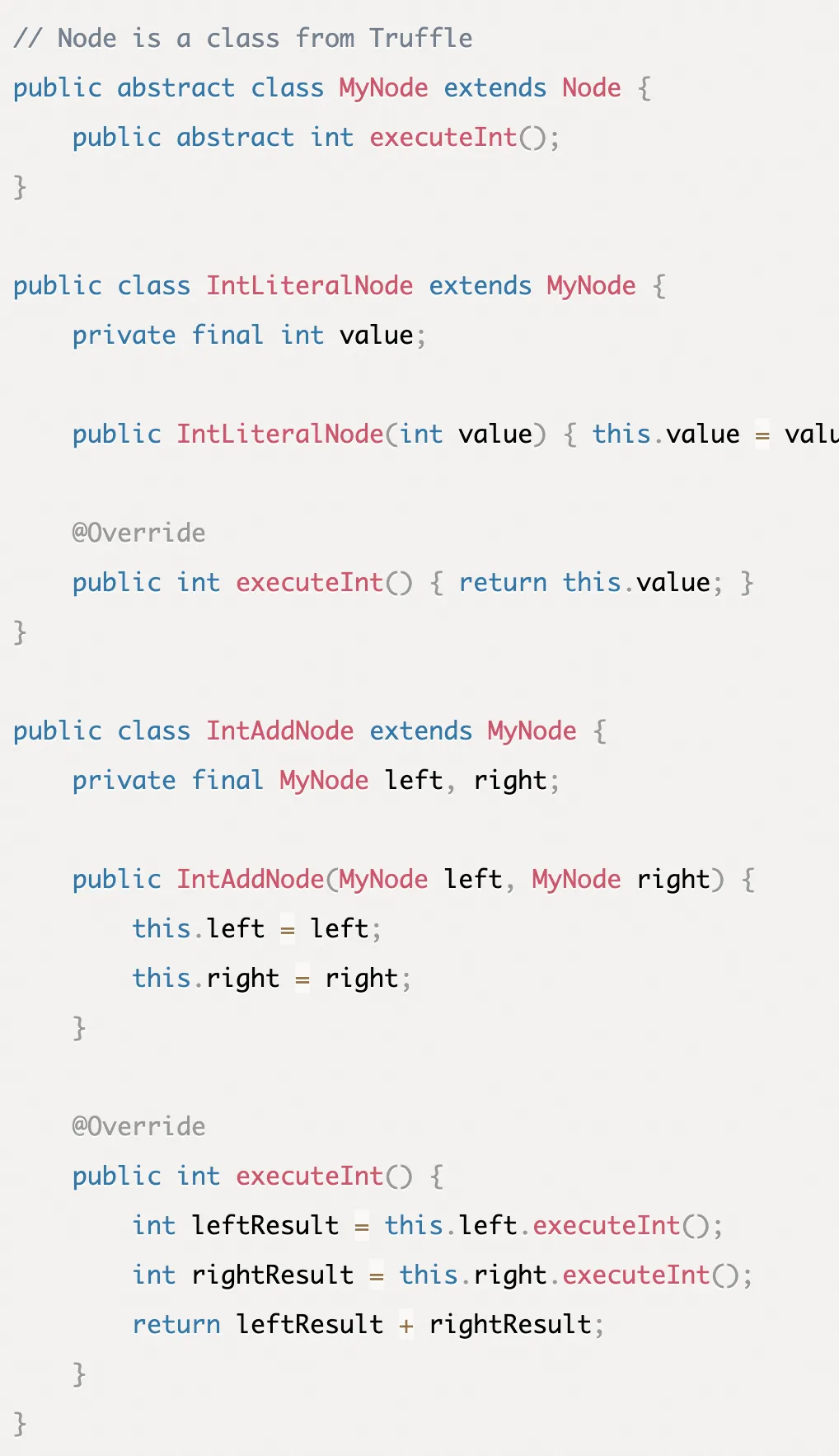 AST树 ,然后在 AST树 上增加了求值函数?没错GraalVM实现语言的方式就是,你不需要定义自己的字节码,你只需要用Java实现AST和AST的求值方式就可以。