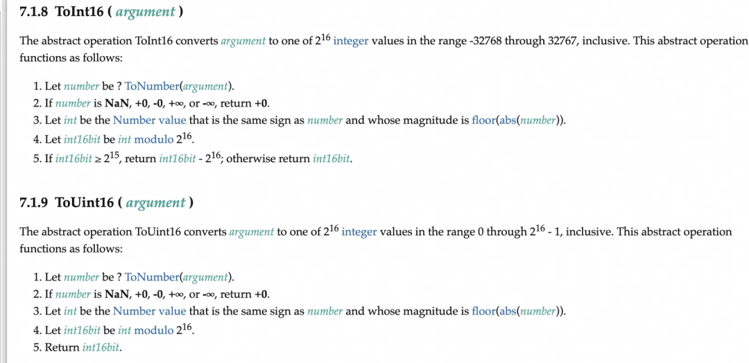 ToInt16 行为,按照规范有1,2,3,4,5多个步骤,步骤中又会用到一些其他步骤,比如 ToNumber 。
