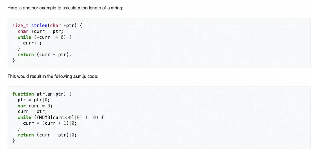 asm.js 编译器变成JS代码的例子,大家可以看到在这个JS产物里多了很多 |0 这样的奇怪代码,这其实是给JS引擎的JIT一个提示,代表了 (curr+1) | 0 的结果一定是 数字类型 。当JS引擎在一个确定的类型下进行JIT编译时,JIT产物的确定性和效率会好很多。这点也符合我们之前JIT的部分讲的,动态类型语言的JIT要在运行时收集类型信息,但是如果类型信息能在语法解析时就确定下来,那么对于JIT编译是一个极大的利好。