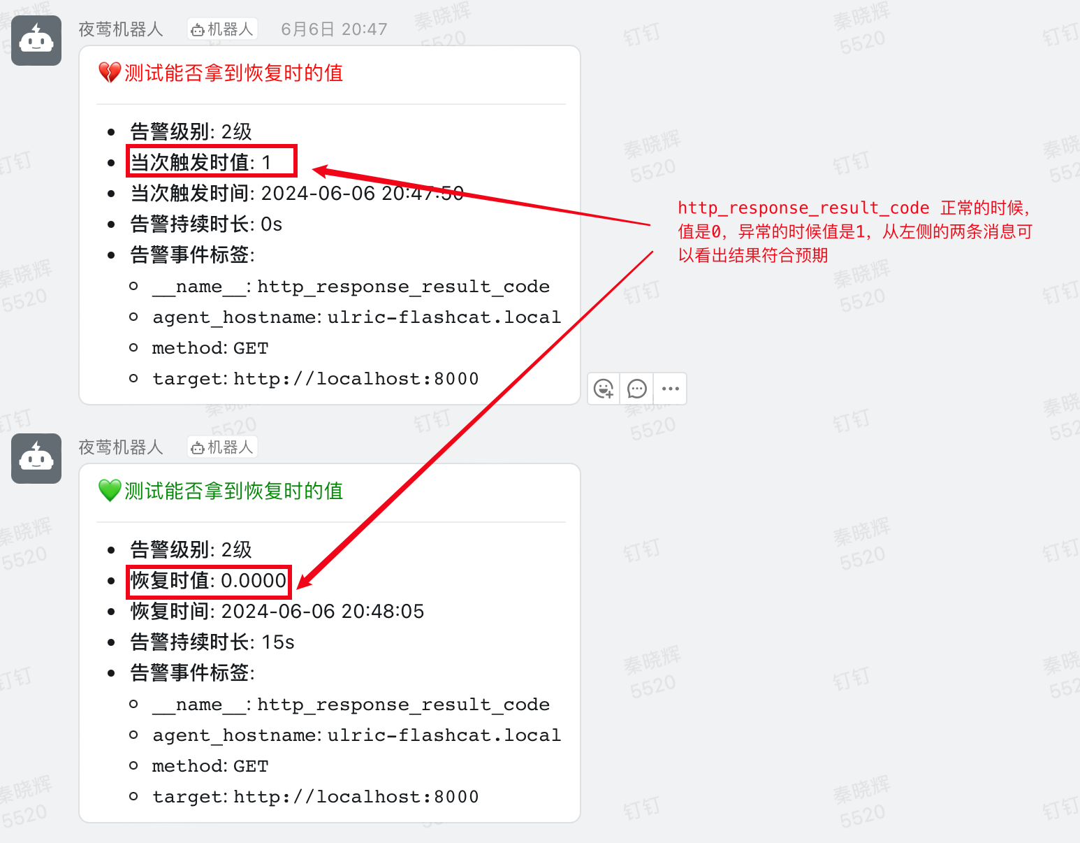 - 在告警恢复的时候,重新发起一次 promql 查询,查询当前最新值。但是要注意,比如 10 台机器同时触发了 load1 告警,某个时刻有 2 台恢复了,查询最新值的 promql 得是准确去查询恢复的 2 台,得对应起来