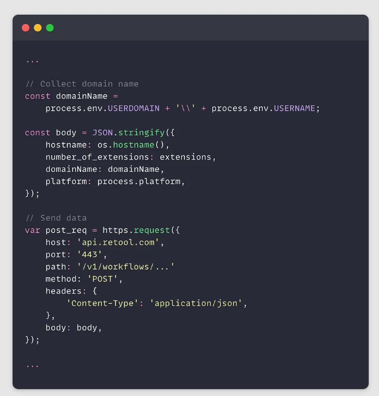 山寨版“Dracula Official”扩展使用了正版 Darcula 主题的代码,但额外包括一个附加脚本,用于收集系统信息,包括主机名、已安装的扩展数量、设备的域名和操作系统平台,并通过 HTTPS POST 请求将其发送到远程服务器。