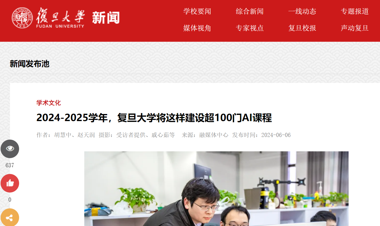 复旦大学6月11日召开2024年招生培养政策发布会,公布今年本科生招生培养政策亮点。从今年秋季学期开始,复旦大学将在 2024-2025 学年推出至少100门AI领域课程。