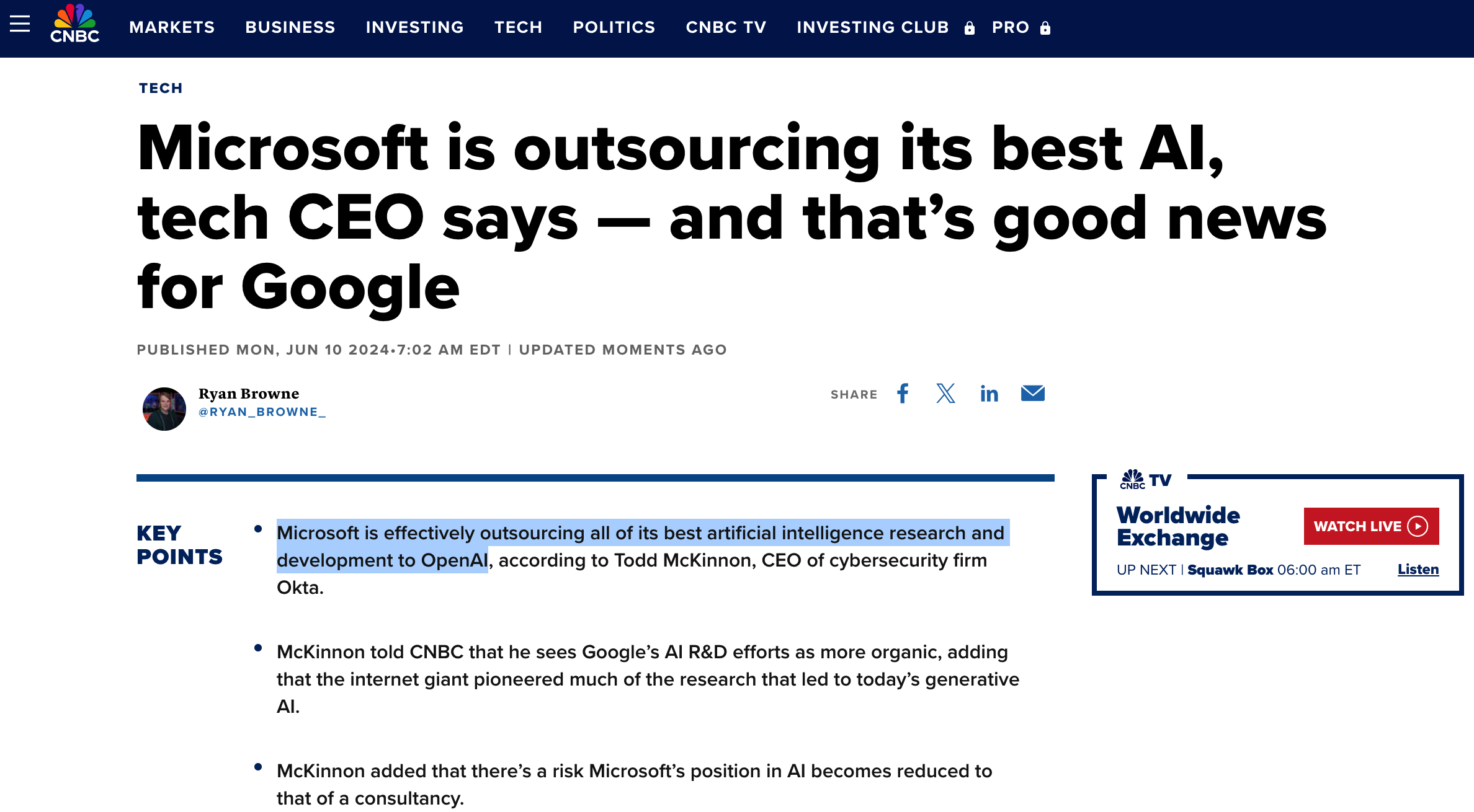 Okta首席执行官Todd McKinnon表示,微软的这一战略举措可能导致其在 AI 领域的地位降低,变成一家咨询公司。他对 CNBC 说道: