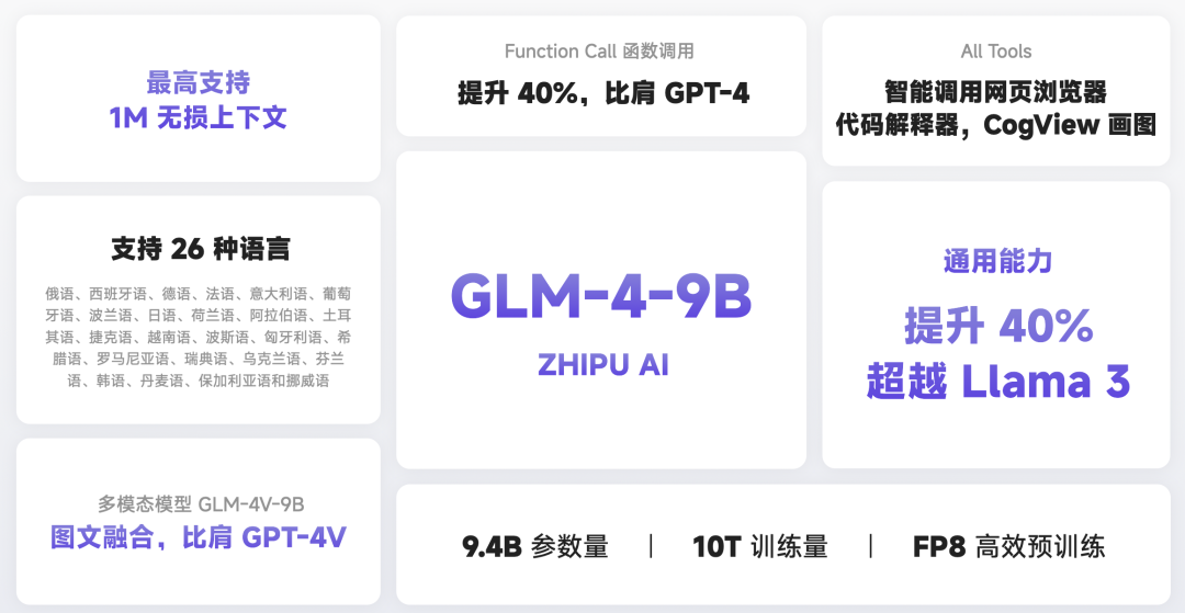 GLM-4-9B 系列模型包括:基础版本 GLM-4-9B(8K)、对话版本 GLM-4-9B-Chat(128K)、超长上下文版本 GLM-4-9B-Chat-1M(1M)和多模态版本 GLM-4V-9B-Chat(8K)。GLM-4-9B 模型具备了更强大的推理性能、更长的上下文处理能力、多语言、多模态和 All Tools 等突出能力。