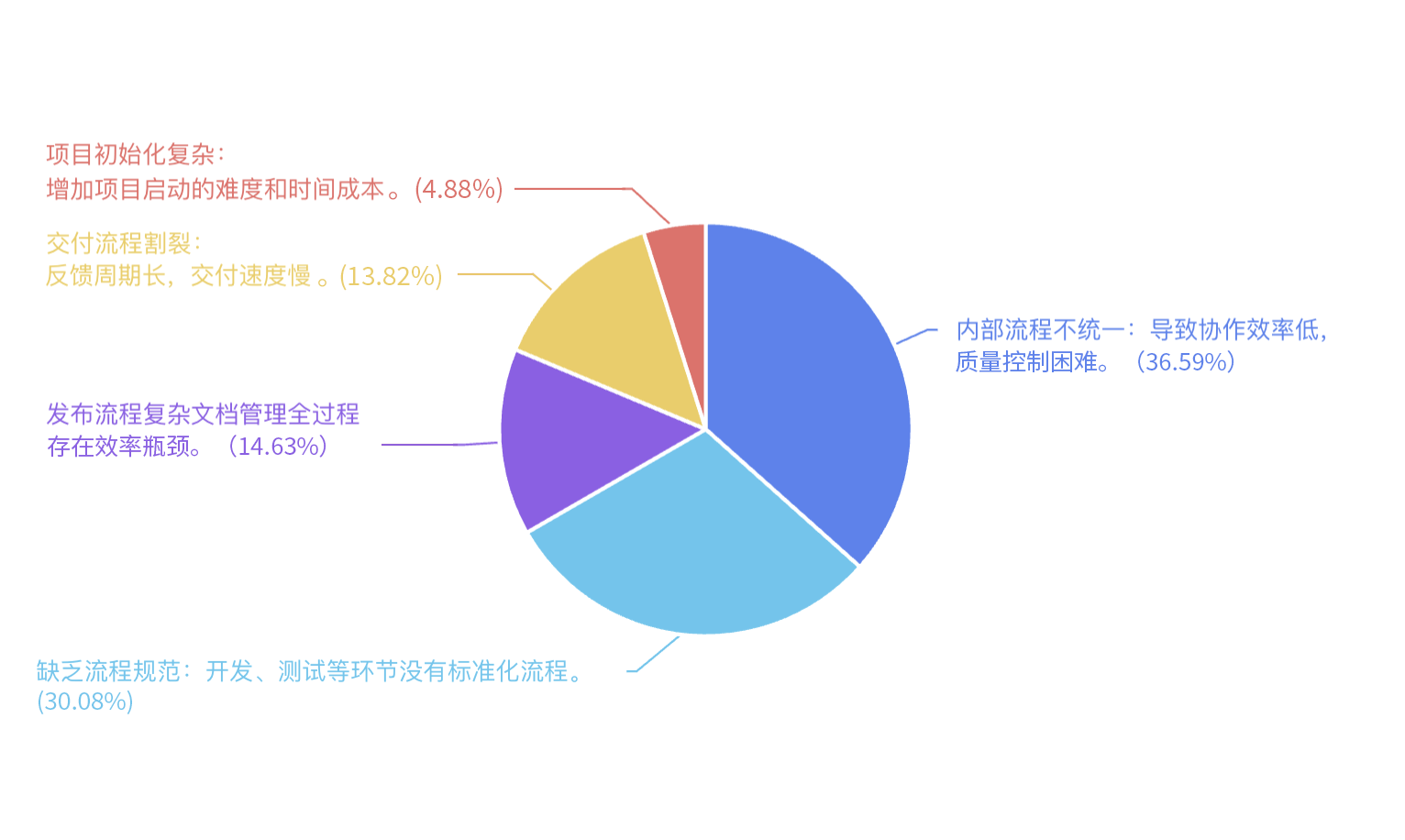 · 流程复杂、碎片化、不一致(37.85%) :超过三分之一的用户认为他们的工作流程存在问题。其中缺乏流程规范,内部流程不统一问题尤为明显,直接导致项目交付缓慢,协作效率低下,质量控制困难。