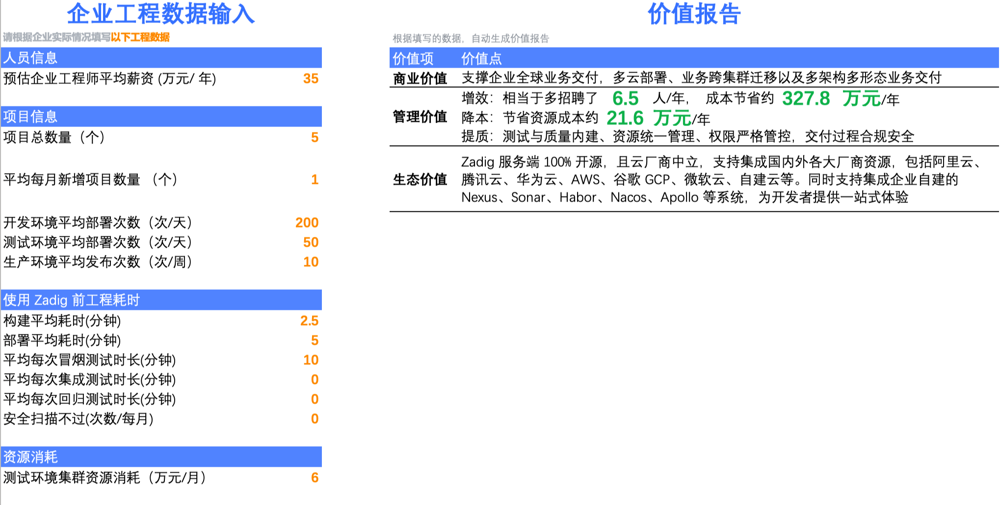 使用方法:输入实际工程数据至“企业工程数据输入”区域,系统将自动生成价值报告。如图中的工程数据样本可预估每年节省 265.2 万元 成本,相当于额外招聘 5.2 名员工。若月资源消耗 6 万元 ,采用 Zadig 预计每年节省 21.6 万元 。