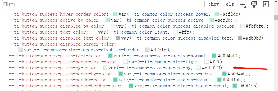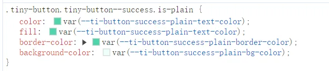 在页面打开控制台,查看 button 的样式,可以看到样式属性值都是使用的 css var 变量。这些变量都以 ti-button 开头,这些可以称之为组件级变量。