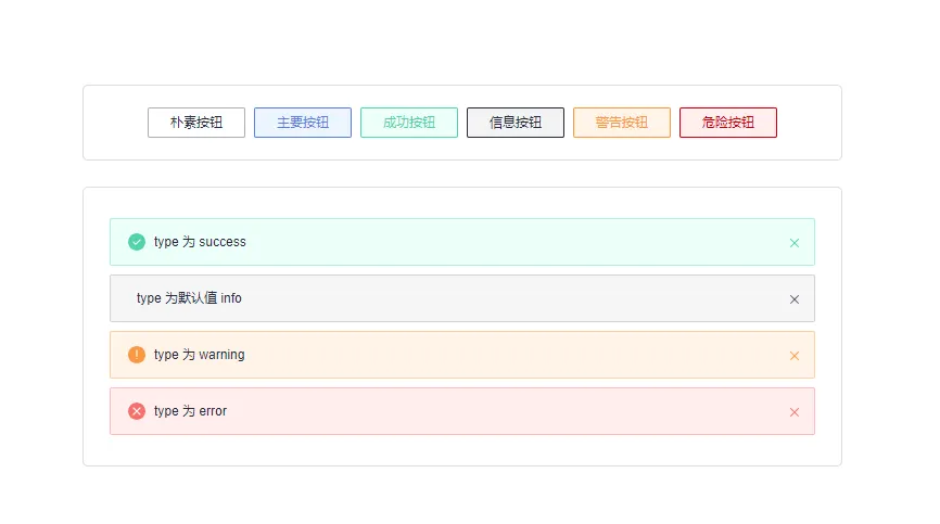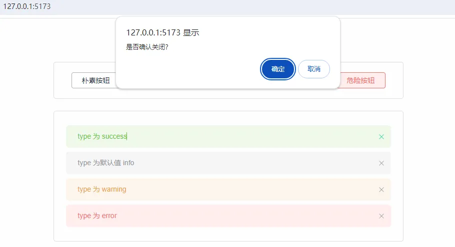完成以上4点,已经完成了 Button 组件和 Alert 组件的类 element 主题适配了,第5点属于拓展内容,试想一下,如果 element 主题在关闭 alert 前,需要弹出确认框确认,应该如何适配?