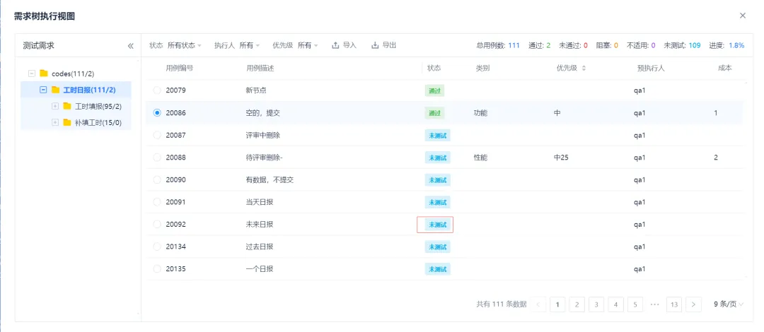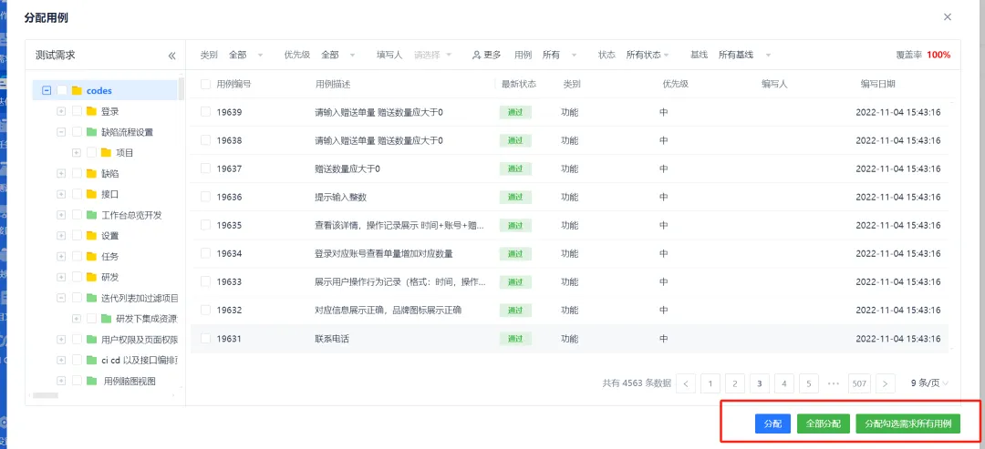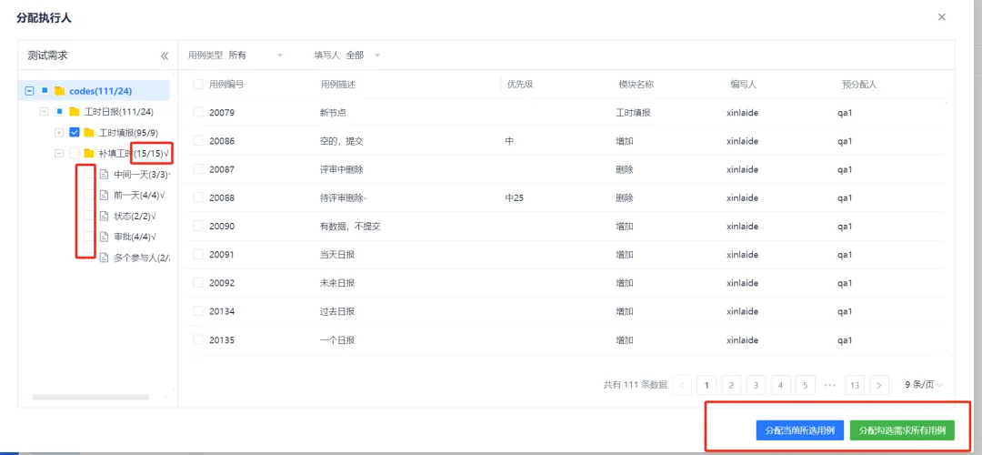 可勾选要分配的用例,也可以左边的树上勾选相关需求,也可把当前查询到的用例全部分配(不用一一勾选)