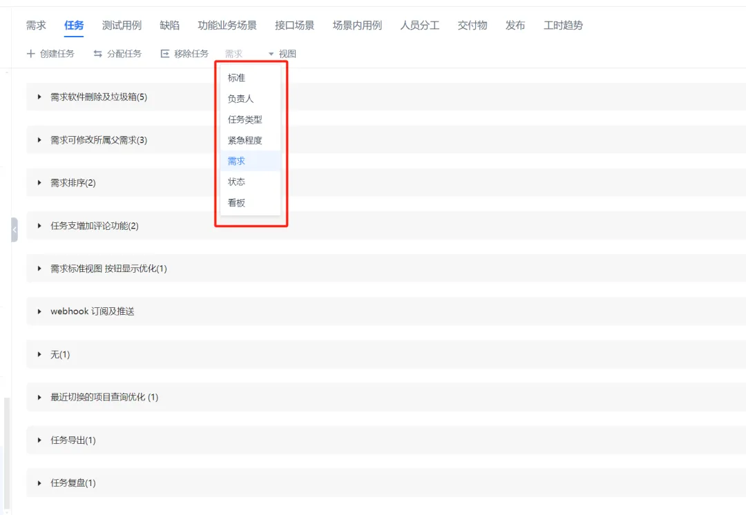 任务分组,可按负责人、任务类型、紧急程度、需求、状态来分组以及以看板视图来显示。