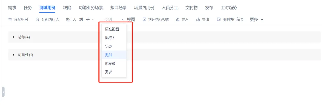 用例分组,可按执行人、状态、类别、优先级和需求来分组显示。标准视图是缺省视图,就是不分组的列表。