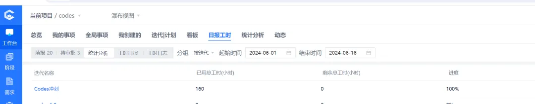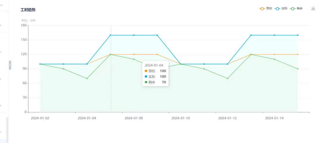 可以查看迭预代估、实际及已用工时的趋势,Codes 中还可查看阶段以及项目的工时的趋势。