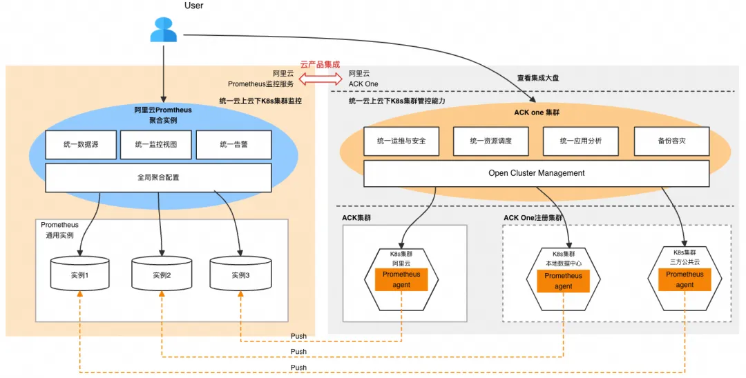 阿里云可观测监控 Prometheus 版通过提供聚合实例,为构建跨越分布式云集群的统一监控需求提供了解决方案。概括来说主要分两个部分: