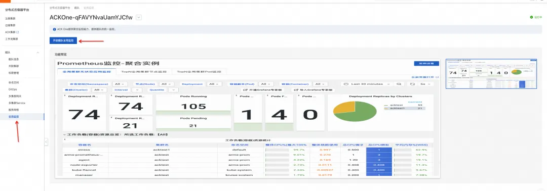 2)在云上统一监控视图: 借助 ACK One 注册集群的能力,您能够将容器监控统一搬到云上,获得了统一的监控体验。此时,各个集群的监控数据仍然是分散的,为了获得统一的聚合监控视图。我们可以进一步借助 ACK One Fleet 将多集群关联起来,同时开启被集成的可观测监控 Prometheus 版全局聚合监控 [ 4] 。