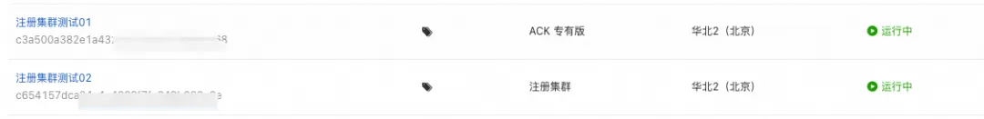 步骤一:准备环境。 在阿里云容器服务控制台创建注册集群 [ 3] ,本文使用如下两个已创建集群,其中"注册集群测试 01"可以类比您本地数据中心或三方云 K8s 集群,"注册集群测试 02"是阿里云注册集群。以此模拟将目标集群"注册集群测试 01"纳管到"注册集群测试 02"中的流程。
