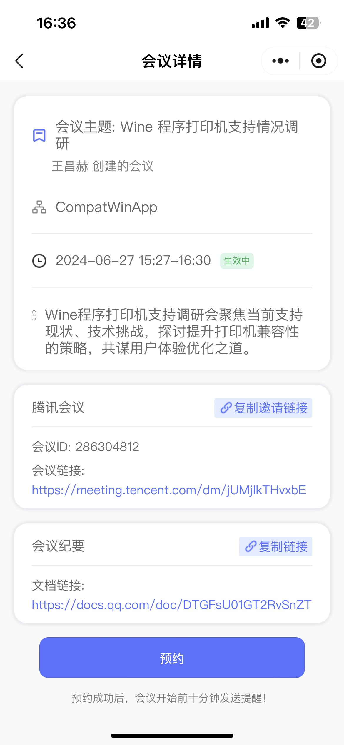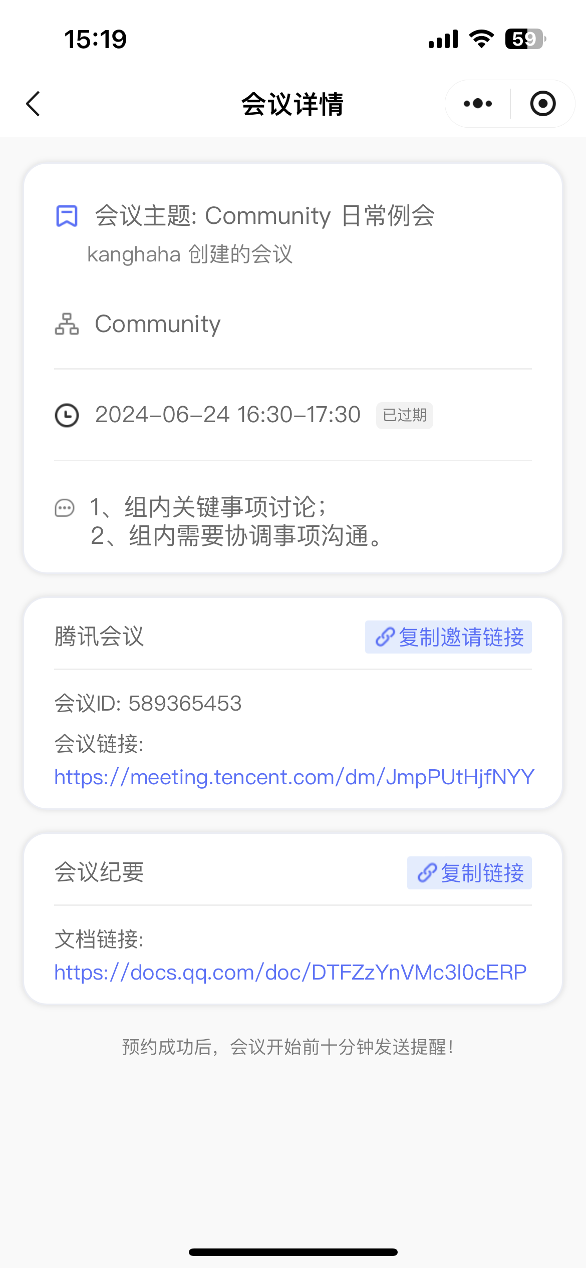 创建完成后在会议列表能看到这个会议,点击预约会议,会议开始前10分钟小程序会进行会议提醒。