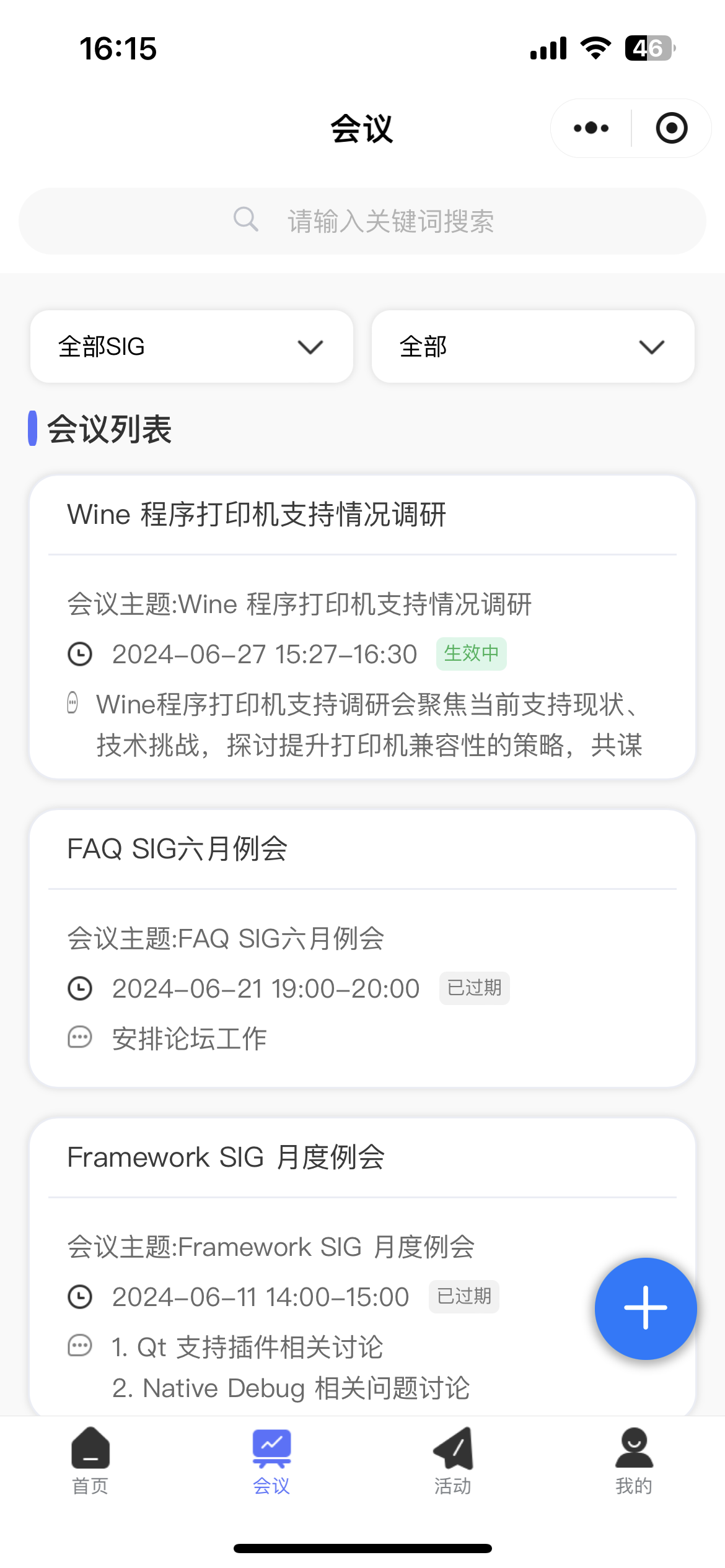 openKylin小程序是openKylin社区为方便社区用户更好的参与社区互动而推出,整合了会议管理、活动管理和问题反馈等功能。通过会议管理功能,可快速的创建会议、查看与预约会议,会议临近时可进行消息提醒,满足社区SIG小组日常便捷开会诉求。