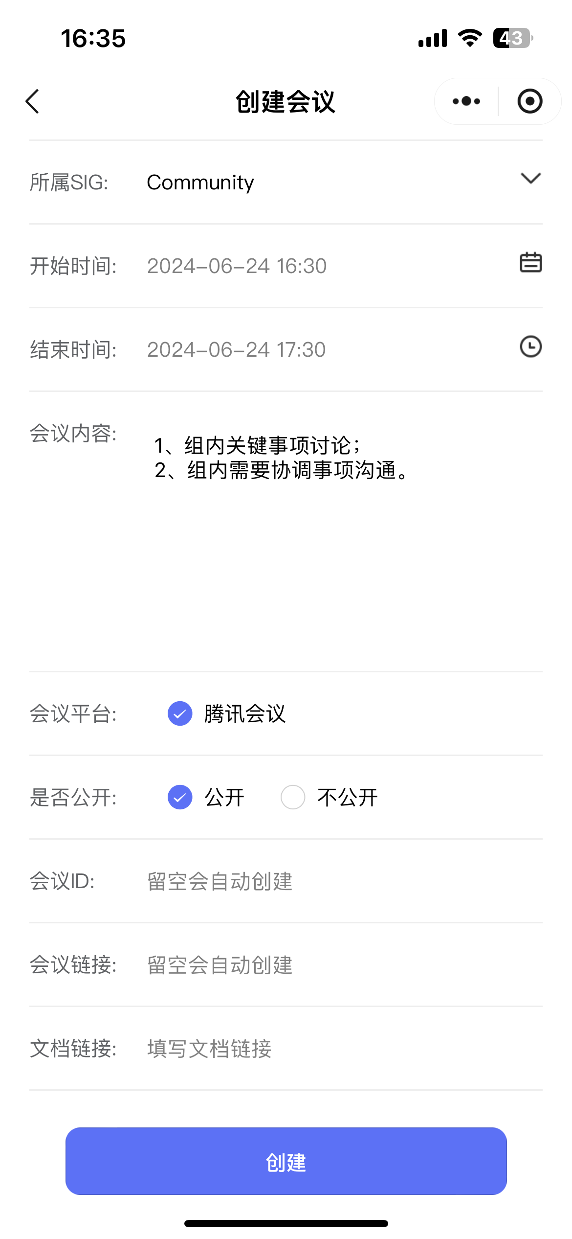 打开openKylin小程序,进入会议页,点击加号创建一个SIG例会,填写会议主题,所属SIG组、会议时间、会议内容、设置会议是否公开(非公开创建时有入会密码),点击创建即完成SIG会议的预定。