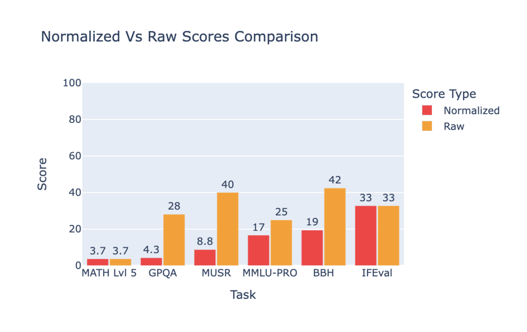 我们决定改变模型的最终得分。我们没有将每个基准输出得分相加,而是将这些得分标准化在随机基线 (0 分) 和最大可能得分 (100 分) 之间。然后我们平均所有标准化分数以获得最终平均得分并计算最终排名。例如,在一个每个问题包含两个选择的基准测试中,随机基线将获得 50 分 (满分 100 分) 。如果使用随机数生成器,您可能会在此评估中获得约 50 分。这意味着得分始终在 50 (如果基准不是对抗性的最低合理得分) 和 100 之间。因此,我们更改范围,使得 50 的原始分数为 0 的标准化分数。这对生成性评估如 IFEval 或 MATH 没有影响。