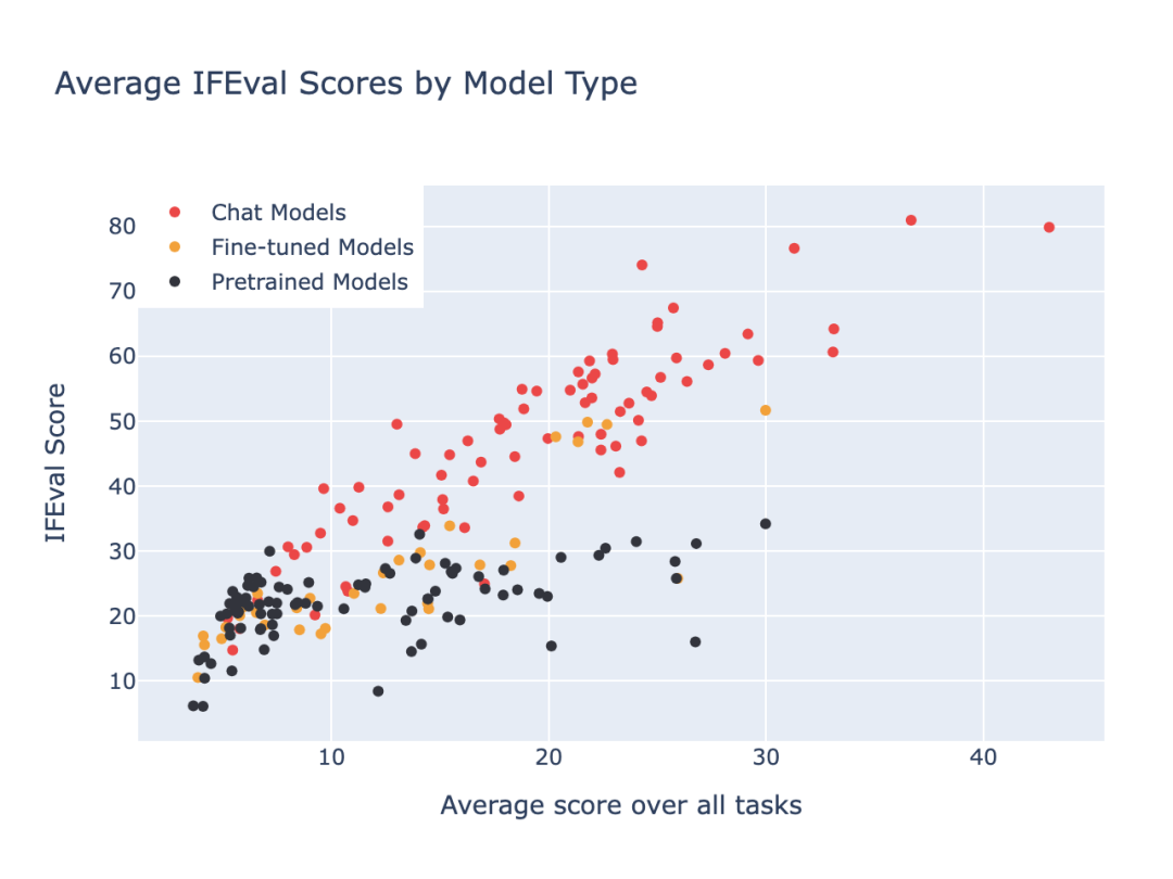 我们的另一个基准,IFEval,针对聊天能力。它调查模型是否能够遵循精确指令。然而,这个基准使用的格式倾向于有利于聊天和指令微调的模型,预训练模型难以达到高性能。