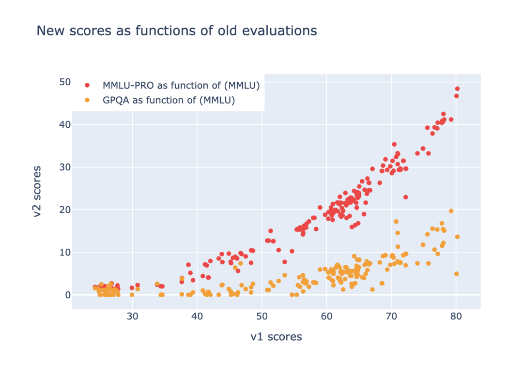 如我们所见,MMLU-PRO (橙色) 和 GPQA (黄色) 得分与 Open LLM Leaderboard v1 的 MMLU 得分合理相关。然而,我们注意到得分总体上低得多,因为 GPQA 难得多。因此,模型有很大的改进空间——这是个好消息 :)