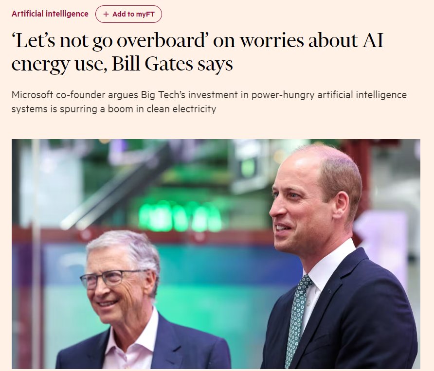《英国金融时报》消息称,比尔·盖茨近日在伦敦的一场讲话中为 AI 系统导致的能源使用快速增长进行了辩护,认为该技术最终将抵消其大量电力消耗。