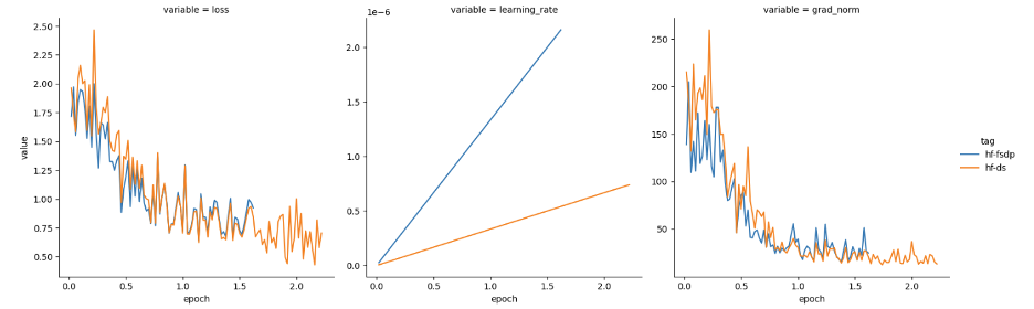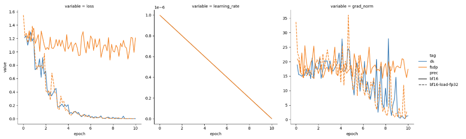 最近,我们尝试分别使用 DeepSpeed 和 PyTorch FSDP 进行训练,发现两者表现有所不同。我们使用的是 Mistral-7B 基础模型,并以半精度 (bfloat16) 加载。可以看到 DeepSpeed (蓝色) 损失函数收敛良好,但 FSDP (橙色) 损失函数没有收敛,如图 1 所示。